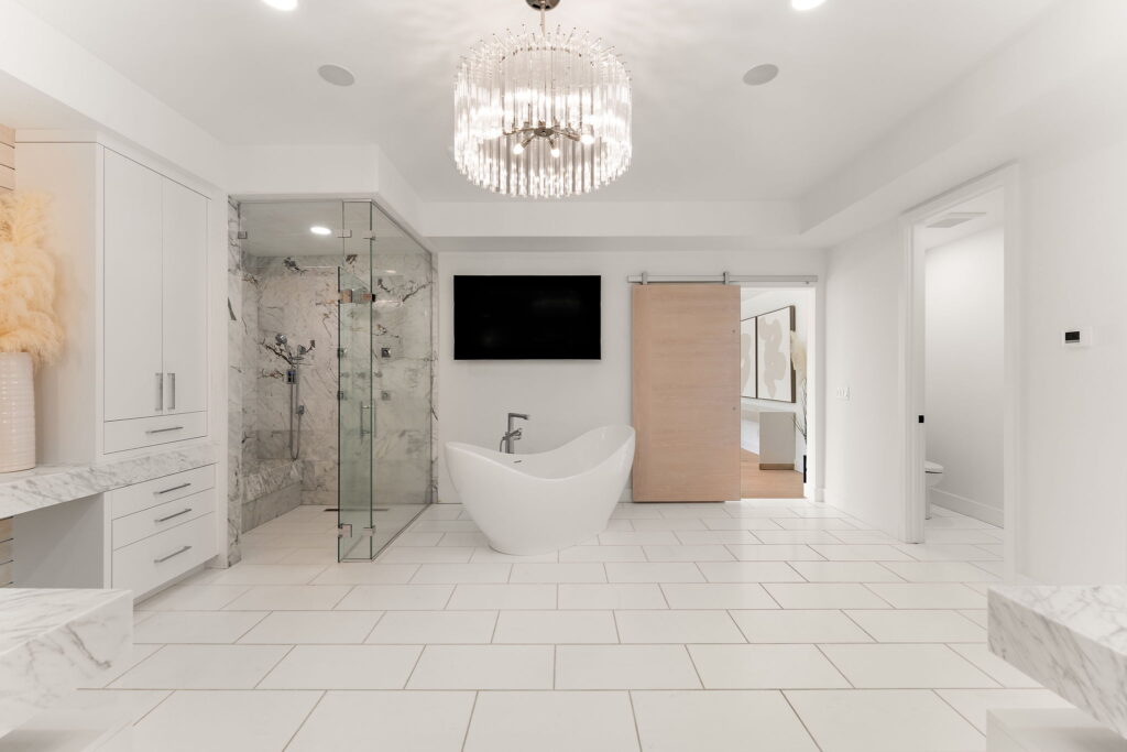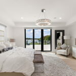 Elegant main-floor primary suite featuring panoramic lake views, spa-style bathroom, and private terrace access
